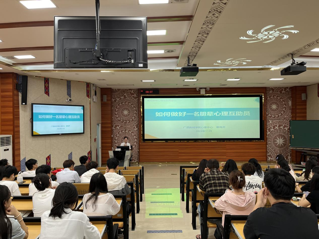 11月16日,我校邀请广西财经学院覃梅芳副教授为同学们开展主题为《如何做好一名朋辈心理互动员》的主题讲座。覃梅芳从朋辈心理互助员的定义、职责、工作要求等方面进行了全面讲授,通过实际案例让同学们更加深入地了解朋辈心理互助员的工作内容和素质要求。她强调,作为朋辈心理互助员,应具备思想道德、心理健康、观察能力、沟通能力和组织协调能力等多方面的素质。