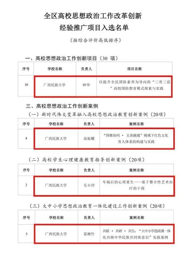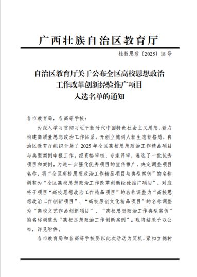 近日,自治区教育厅公布了全区高校思想政治工作改革创新经验推广项目入选名单。我校共有 4 个项目荣登榜单。钟华主持的《以提升全民国防素养为导向的“三育三促 ”高校国防教育模式探索与实践》入选高校思想政治工作创新项目,高崧耀主持的《“ 四维协同 · 五育融通 ”视域下红色文化育人体系的构建与实践》、毛小玲主持的《车祸后的心理重生——基于整合性艺术治疗的干预》、雷湘竹主持的《共联·共研·共生:“大中小学思政课一体化共铸中华民族共同体意识 ”实践案例》项目入选高校思想政治工作创新案例。
