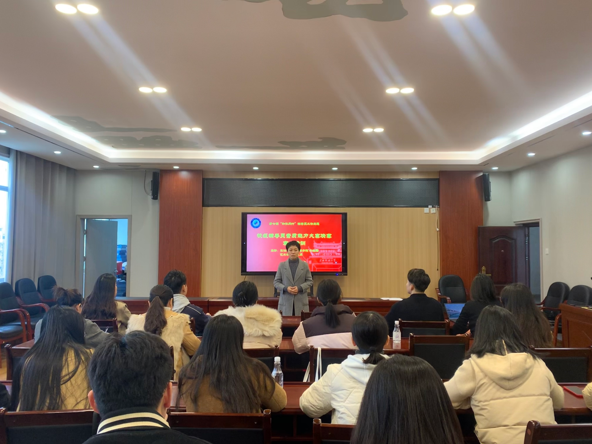 12月26日,我校在大学生活动中心303室开展第七期“和你同行”辅导员工作主题分享会,分享主题为“校级辅导员素质能力大赛决赛赛前培训”,政治与公共管理学院团委书记农植媚、艺术学院辅导员陈亚卓受邀作分享,2025年校级辅导员素质能力大赛决赛选手参加。培训会由学生工作部(处)副部(处)长韩燕燕主持。