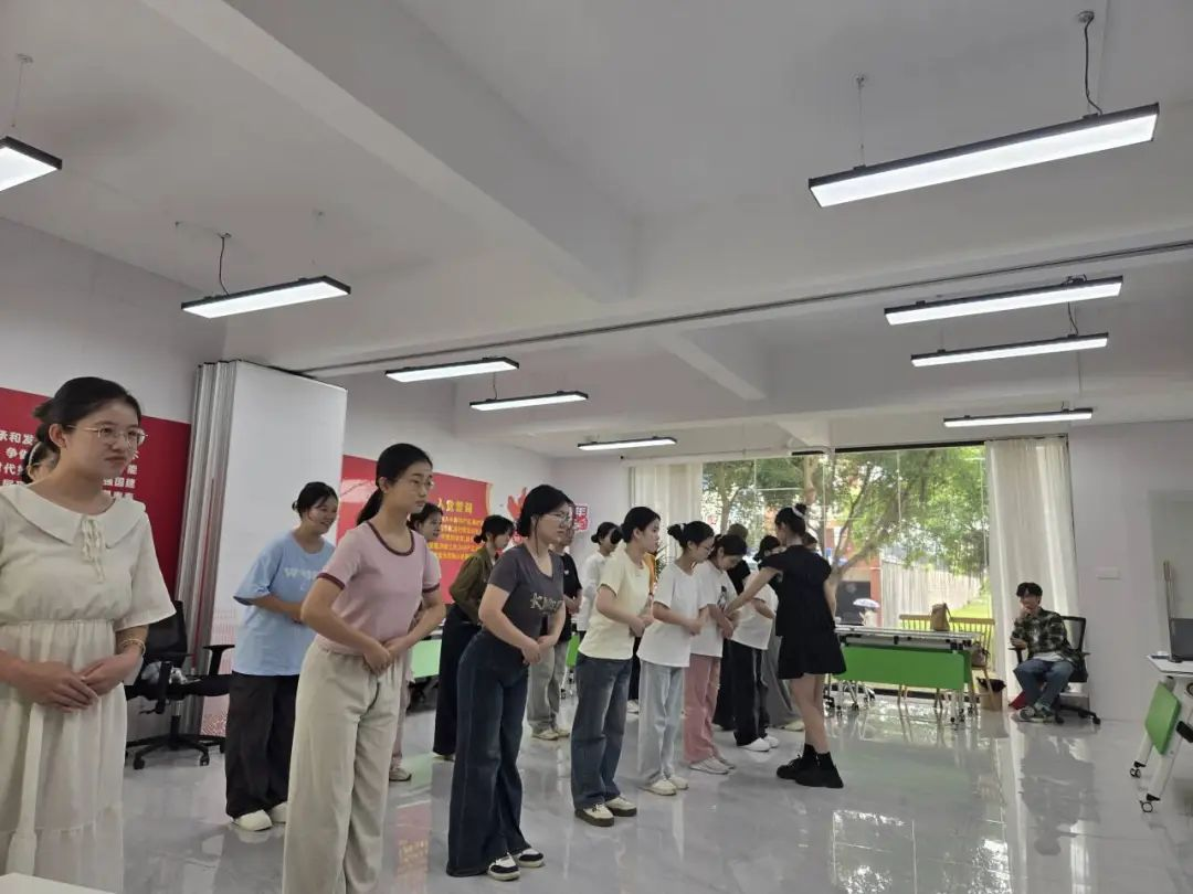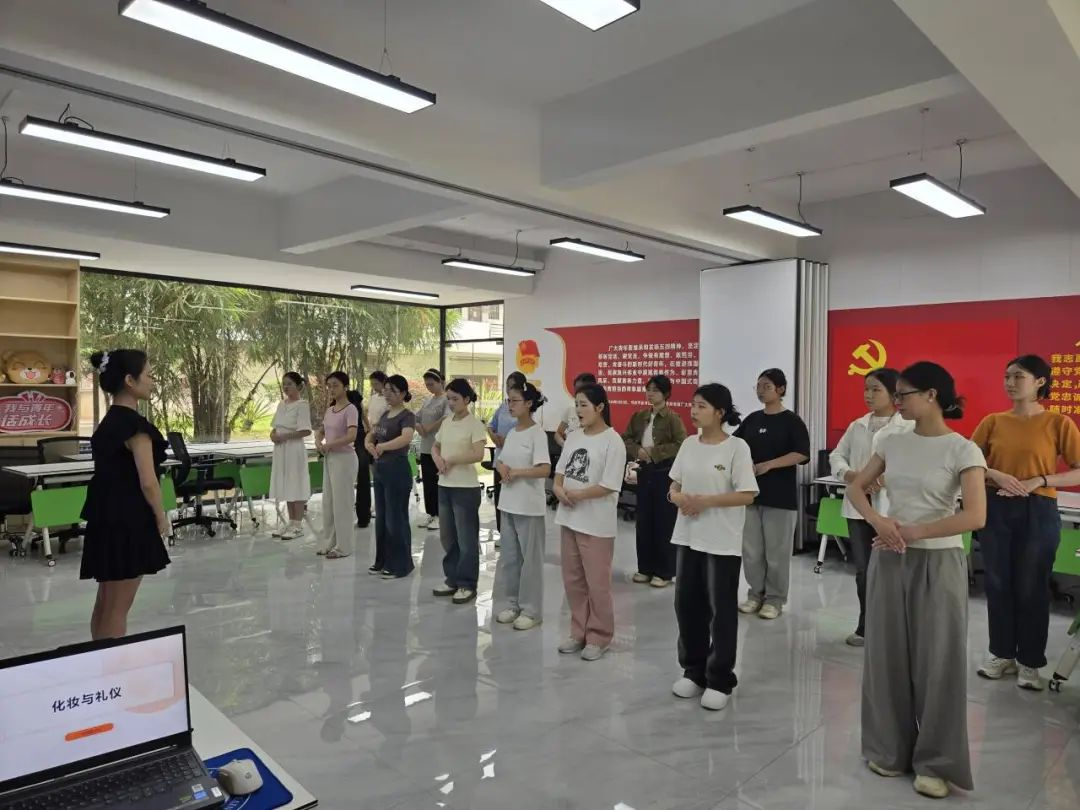 蒙鸿临向同学们展示了礼仪妆和日常淡妆的正确操作流程,并对学员们的妆容进行了细致的点评。黄雯馨则结合学校礼仪队的迎宾经验,对迎宾礼仪动作进行了分解教学,并指导大家练习了相应的步态和手势。