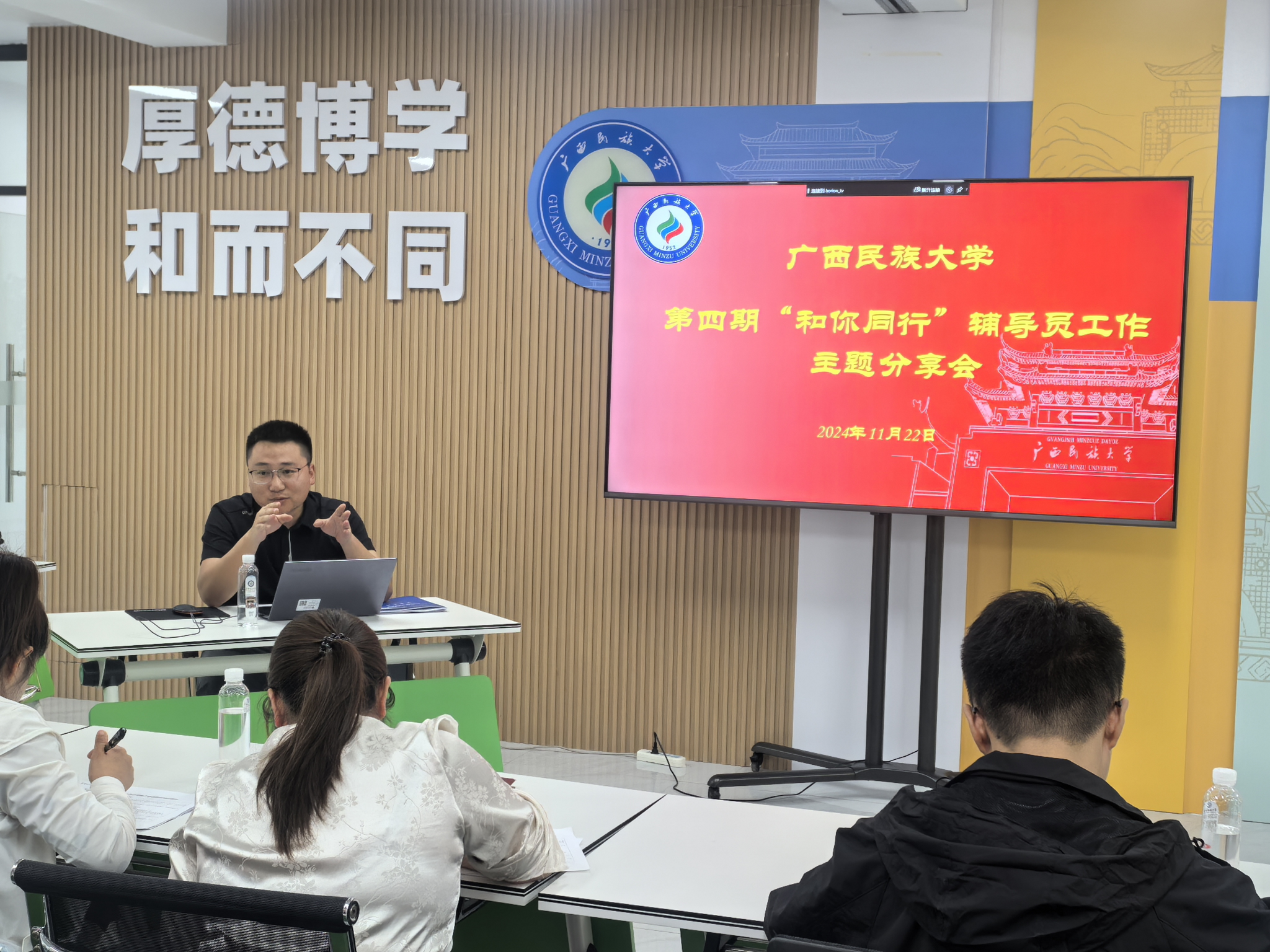 11月22日下午,我校在思源湖校区“一站式”学生社区举办第四期“和你同行”辅导员工作主题分享会。学生工作部(处)张志强老师以“‘一站式’学生社区的管理与使用”为题作分享,各学院辅导员代表参加。会议由学生工作部(处)高崧耀老师主持。